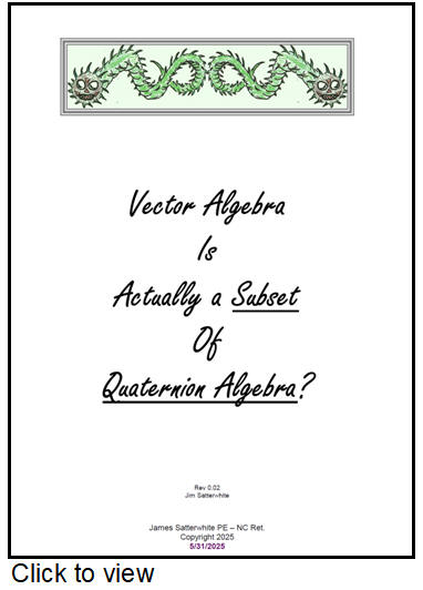 In February of 2022 I submitted an article by the title of "On Maxwell's Special Theory of Electromagnetism" to QEX for publication. It was accepted in March. I received the proof copy from QEX in July and began reviewing it and in addition to finding errors of mine and theirs, I found a significant flaw in in my presentation and needed a small addition to the paper to clear it up. Well, that resulted in Mexican Standoff, that ended in my retraction of the right to publish the article. A month or s ago, I contacted them and asked if they might reconsider after two and a half years and they replied that they no longer had the files. So, that chapter comes to an end and now I will publish it here. I take credit for burning my bridge with QEX for whom I have the greatest respect. The paper with some additions is below. (.Maxwell.) (.Quaternions.) |