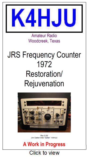 (.Projects.) [.Ground Ohms.] [.Freq Counter 1972.] [.Frequnecy Standards.] In 1972 I designed and built a battery operated frequency counter as a lunch time project at Bell Labs. Recently, I experienced a failure in that counter and I decided to rejuvenate/renovate it. I have accomplished that and written up some of the process. Comments teli@teli.us |