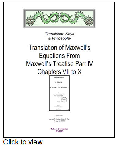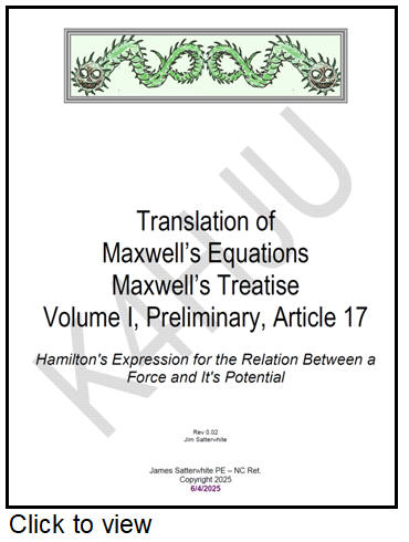 This area is under construction. (.Maxwell.) (.Quaternions.) In my pursuit of understanding Maxwell and his far reaching equations, I have undertaken the work of transcribing the the sections of his Treatise dealing with the derivation of his equations into modern notation in the hope that it will be more easily understood. I have made one pass at that and am not quite satisfied with the form I have come with and in the process of going back thru them. My intent is to publish those works here in the near future. For now I will leave a taste of my work for you to consider. This is a supporting article from Volume I of his treatise. Also, included is a key to the works. Keep in mind that this is a Work In Progress.